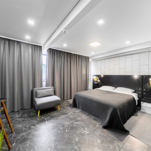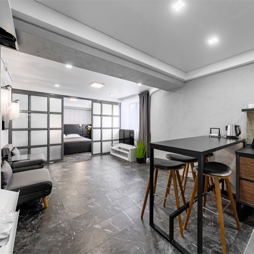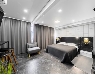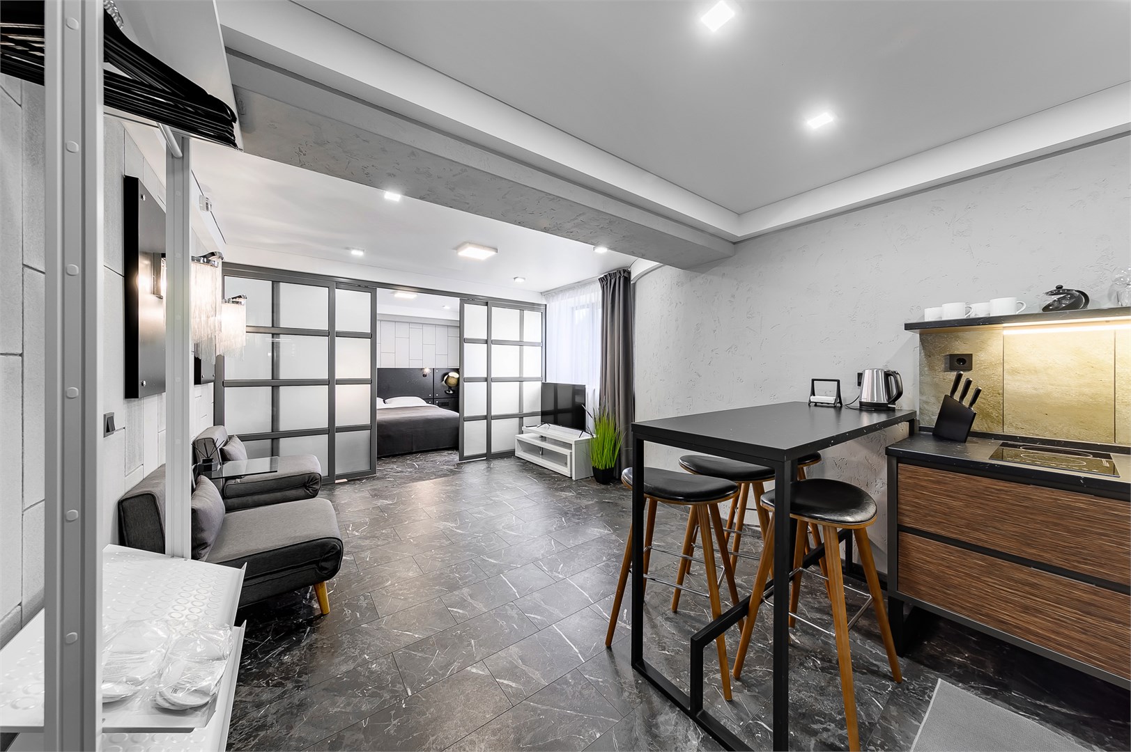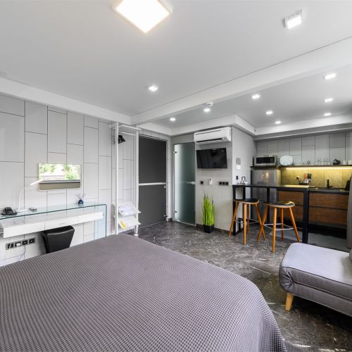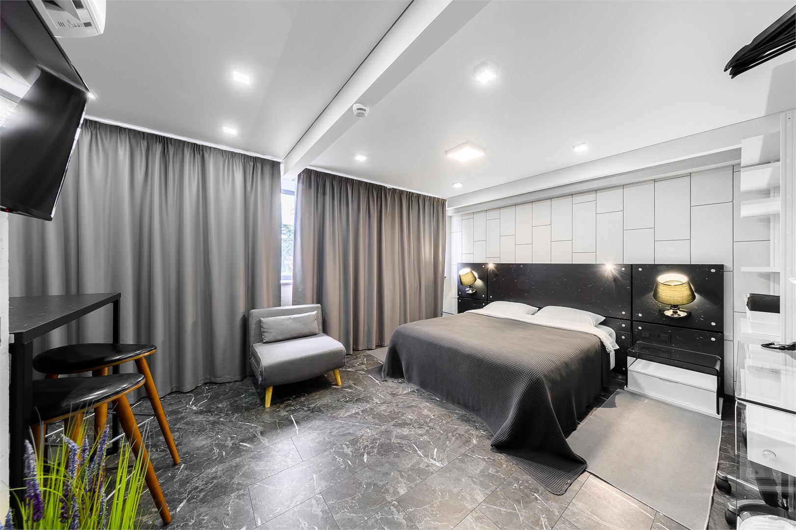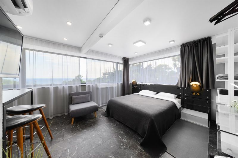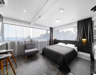 Апартаменты находятся в элитном комплексе Идеал Хаус, возвышающемся на главной магистрали города – Курортом проспекте. В распоряжении гостей комфортабельные двухместные номера с видом на море или парк. Апартаменты оборудованы мебелью и техникой премиум-класса и оформлены в минималистичном стиле. Везде предусмотрена кухня, ванная комната, где для гостей подготовлены халаты, тапочки косметические принадлежности, в комнатах – двуспальные кровати, кондиционер и теплый пол.